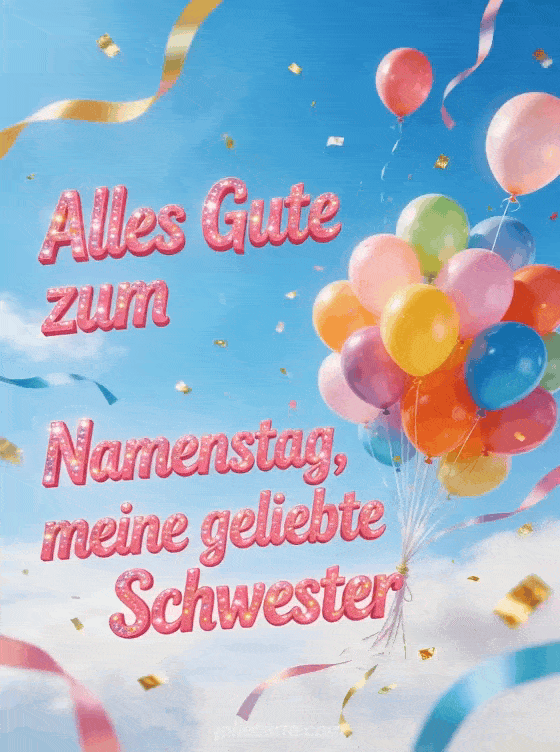 Feiere den Namenstag deiner Schwester mit dieser farbenfrohen kostenlosen Karte. Bunte Helium-Ballons steigen in einen leuchtend blauen Himmel, Bänder wehen im Wind und goldene Konfetti. Entdecke auch eine Geburtstagskarte Schwester oder eine Geburtstagskarte Schwester Humor oder eine lustige Geburtstagskarte Schwester.
