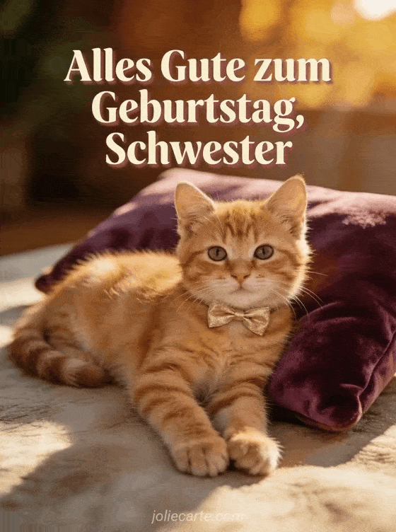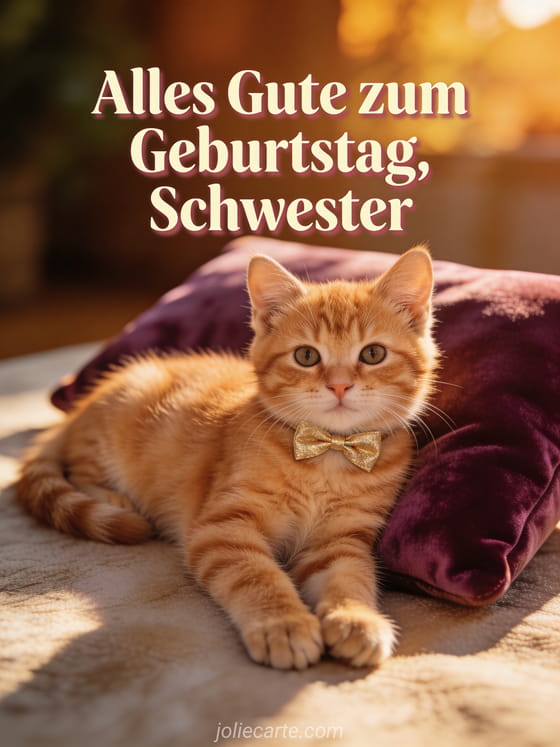 Feiere den Geburtstag deiner Schwester mit dieser entzückenden kostenlosen Karte. Ein süßes rotes Kätzchen auf einem Samtkissen mit goldener Fliege, das dich zärtlich im warmen Nachmittagslicht anschaut. Entdecke auch eine Geburtstagskarte Schwester Nachricht oder eine Geburtstagskarte Schwester oder eine Geburtstagskarte Schwester Humor.