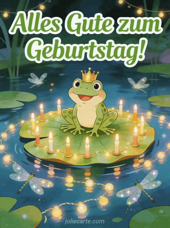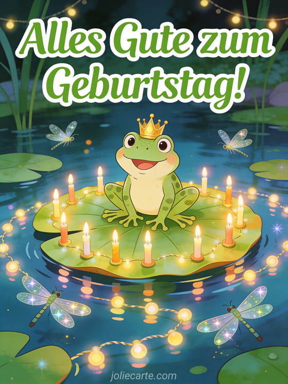 Überraschen Sie jemanden mit dieser lustigen Geburtstagskarte mit einem witzigen Frosch mit goldener Krone auf einem riesigen dekorierten Seerosenblatt mit funkelnden Libellen. Entdecken Sie auch eine Geburtstagskarte für Tochter mit Liebe oder eine Geburtstagskarte für geliebte Tochter.