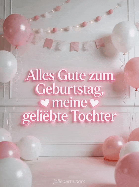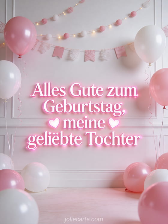 Feiere den Geburtstag deiner Tochter mit dieser wunderschönen kostenlosen Grußkarte. Leuchtende rosa Buchstaben mit Herz-Effekten, rosa und weiße Ballons und Girlanden in fröhlicher Atmosphäre. Entdecke auch eine Geburtstagskarte für die Tochter oder eine Geburtstagskarte mit Feen.
