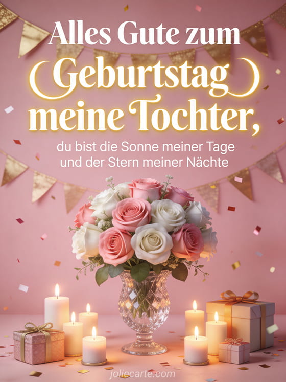 Du bist die Sonne meiner Tage und der Stern meiner Nächte. Senden Sie diese romantische Geburtstagskarte an Ihre Tochter mit Rosen, Kerzen und Geschenken. Entdecken Sie auch eine emotionale Geburtstagskarte für die Tochter oder ein Geburtstagsgedicht für die Tochter.