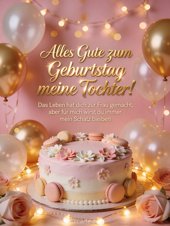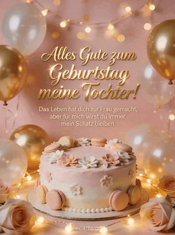 Versenden Sie einen herzlichen Geburtstagsgruß an Ihre Tochter und erinnern Sie sie daran, dass sie immer Ihr Schatz bleiben wird. Entdecken Sie auch eine Karte alles Gute zum Geburtstag meine Tochter jedes neue Jahr, alles Gute zum Geburtstag meine Tochter Sonne meiner Tage oder alles Gute zum Geburtstag meine Tochter.