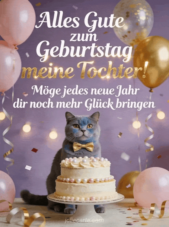 Möge jedes neue Jahr dir noch mehr Glück bringen. Senden Sie diese fröhliche Geburtstagskarte an Ihre Tochter mit einer British Shorthair Katze, Kuchen und Ballons. Entdecken Sie auch eine Geburtstagskarte für erwachsene Tochter oder eine Geburtstagsgedicht-Karte für die Tochter.