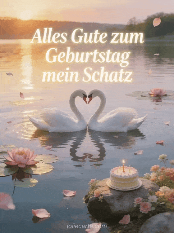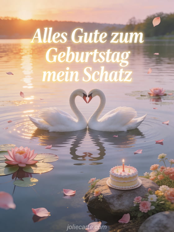 Feiere den Geburtstag der Person, die du liebst, mit dieser wunderschönen kostenlosen Grußkarte. Zwei weiße Schwäne formen ein Herz auf einem ruhigen See bei Sonnenuntergang mit goldenen Reflexen, rosa Seerosen und einer Geburtstagstorte. Entdecke auch eine romantische Geburtstagskarte oder eine Geburtstagskarte für den Schatz oder eine Geburtstagskarte für die Liebste.