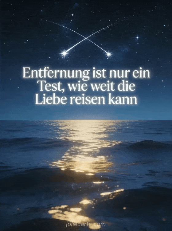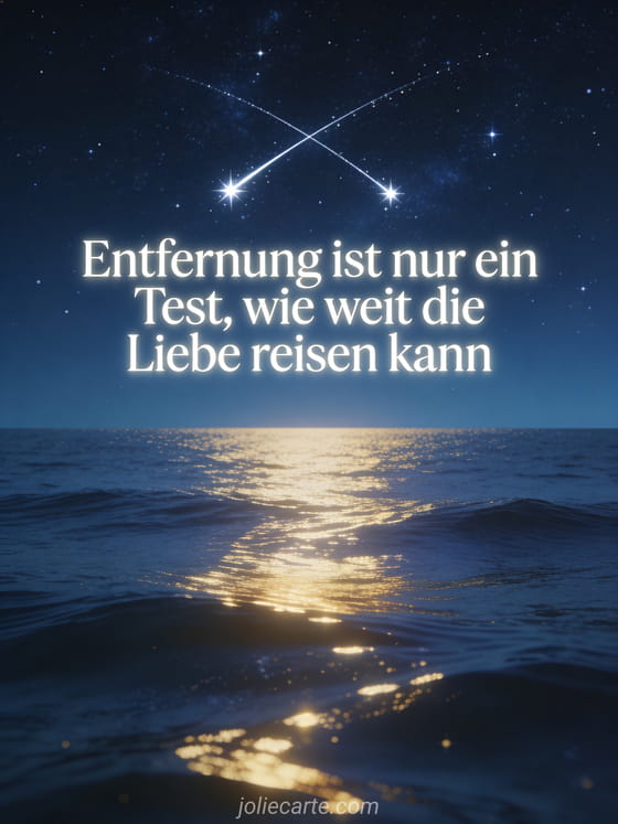 Teilen Sie diese inspirierende Botschaft über die Kraft der Liebe, die jede Entfernung überwindet. Eine wunderschöne Erinnerung, dass wahre Liebe keine Grenzen kennt. Entdecken Sie auch eine Nachricht für Ihre Fernbeziehung.