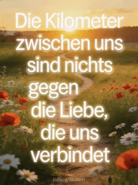 Erinnern Sie jemanden daran, dass die Kilometer zwischen Ihnen nichts gegen Ihre Liebe sind mit dieser hoffnungsvollen Grußkarte. Eine wunderschöne Botschaft der Liebe, die jede Entfernung besiegt. Entdecken Sie auch ein Zitat über Liebe auf Distanz oder eine Nachricht für Ihre Fernbeziehung.