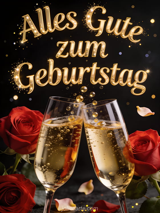 Feiern Sie einen besonderen Geburtstag mit dieser eleganten Karte mit Champagnergläsern und roten Rosen mit goldenem Glitzer. Entdecken Sie auch eine lustige Geburtstagskarte oder eine Karte mit Geburtstagsspruch.