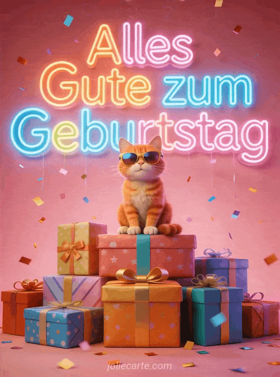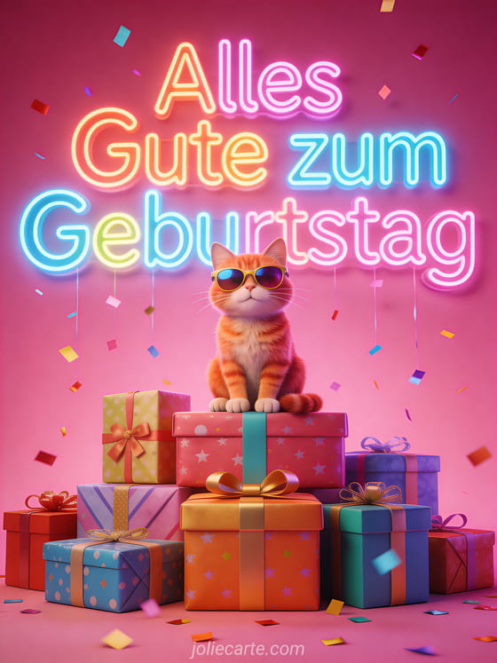 Sende diese festliche Geburtstagskarte mit einer coolen roten Katze mit Sonnenbrille auf verpackten Geschenken mit Neonlichtern und Konfetti. Entdecke auch eine lustige Otter-Geburtstagskarte oder eine glamouröse Katzen-Geburtstagskarte.