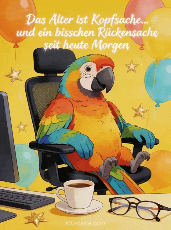 Sende diese witzige Geburtstagskarte mit einem bunten Papagei im Bürostuhl mit Kaffeetasse und Lesebrille. Entdecke auch eine lustige Otter-Geburtstagskarte oder eine glamouröse Katzen-Geburtstagskarte.