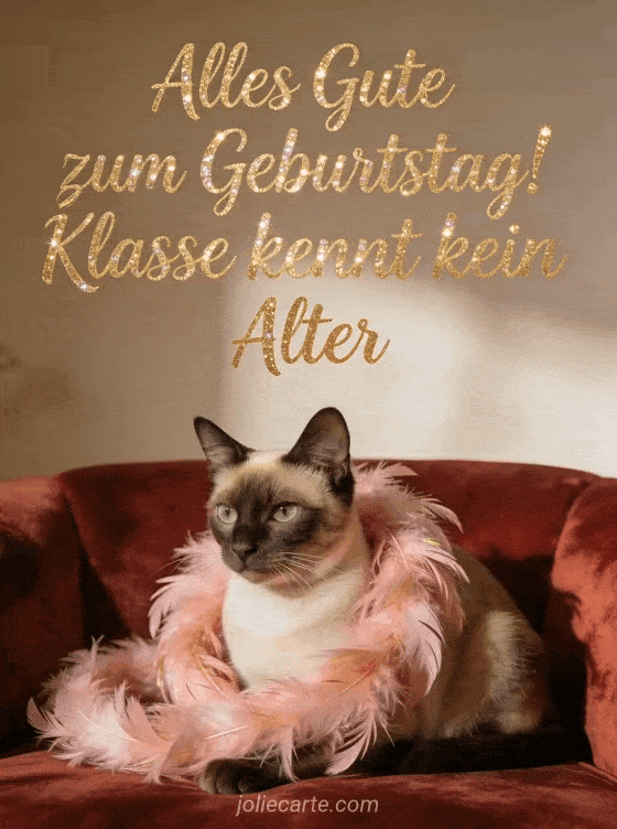 Sende diese glamouröse Geburtstagskarte mit einer fabelhaften Siamkatze mit rosa Federboa auf einem roten Samtsofa. Entdecke auch eine lustige Geburtstagskarte fĂŒr Frauen oder ein lustiges Katzen-Geburtstags-GIF.