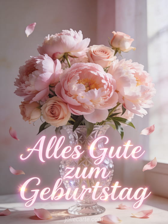 Verschicken Sie diese bezaubernde Geburtstagskarte mit einem praechtigem Strauss aus Pfingstrosen und Rosen in einer Kristallvase, mit sanft fallenden Bluetenblaettern in zartem natuerlichem Licht. Entdecken Sie auch eine animierte Geburtstagskarte mit Feuerwerk oder eine animierte Geburtstagskarte.