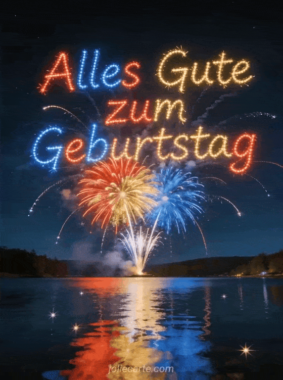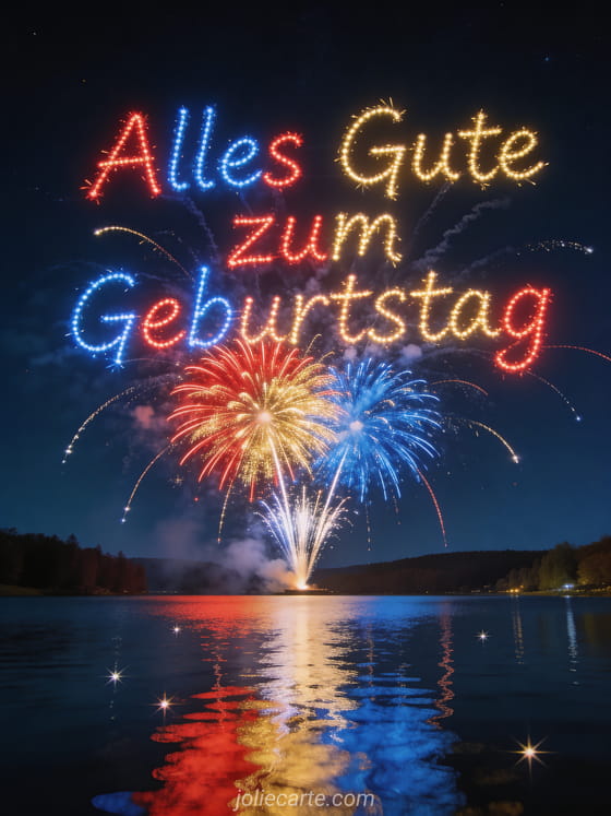 Verschicken Sie diese grossartige Geburtstagskarte mit spektakulaerem Feuerwerk in goldenen, roten und blauen Kaskaden ueber einem See, mit Sternschnuppen und Spiegelungen auf dem Wasser. Entdecken Sie auch eine animierte Geburtstagskarte mit Blumen oder eine Kindergeburtstagskarte.