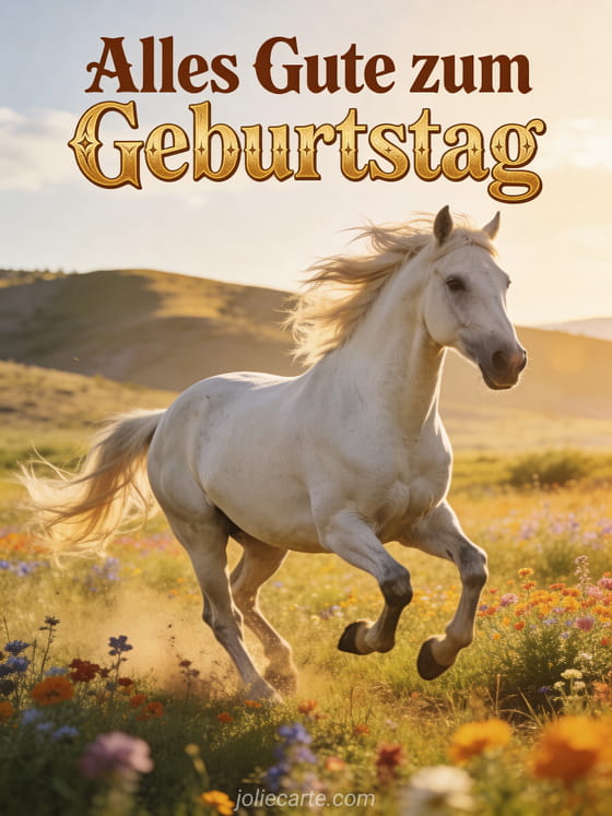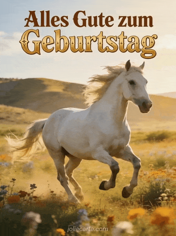 Senden Sie einen beeindruckenden Geburtstagsgruß mit einem majestätischen Pferd, das im goldenen Sonnenuntergang galoppiert. Entdecken Sie auch ein animiertes Geburtstags-GIF gratis oder ein Geburtstags-GIF mit Blumen.