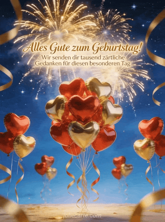 Feiere einen Geburtstag mit dieser prÀchtigen kostenlosen Karte. Herzförmige rote und goldene Ballons mit anmutigen BÀndern, goldenes Feuerwerk vor einem sternenklaren blauen Nachthimmel, in einer festlichen und majestÀtischen AtmosphÀre.