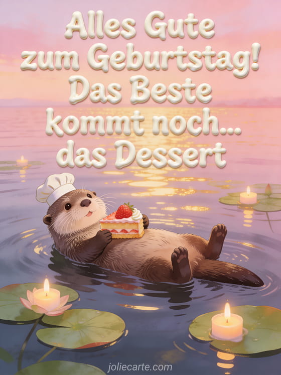 Sende diese entzückende Geburtstagskarte mit einem süßen Otter-Koch der auf dem Wasser treibt und eine Erdbeertorte hält. Entdecke auch eine glamouröse Katzen-Geburtstagskarte oder eine lustige Geburtstagskarte für Frauen.