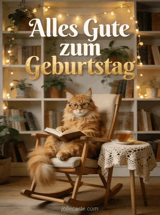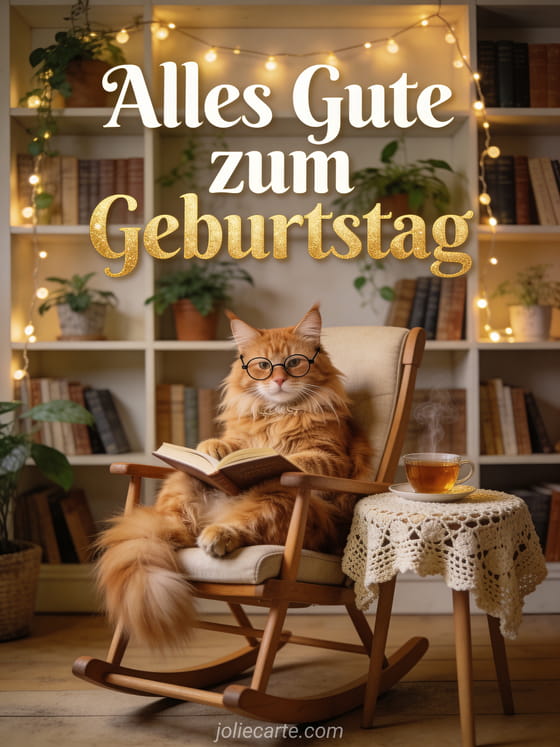 Senden Sie einen herzlichen und lustigen Geburtstagsgruß, um diesen besonderen Tag mit gemütlicher Atmosphäre aufzuheitern. Diese entzückende Karte ist perfekt für Katzen- und Bücherliebhaber. Entdecken Sie auch einen lustigen Geburtstag mit Humor für Frauen oder einen witzigen Geburtstags-Spruch mit Humor.