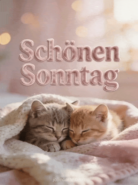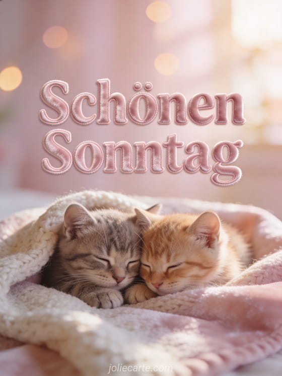 Verschicken Sie einen zärtlichen Sonntagsgruß mit dieser liebevollen Karte. Zwei bezaubernde Kätzchen aneinander gekuschelt auf einem Wollplaid im warmen Nachmittagslicht, eine fotorealistische Szene purer Zärtlichkeit.