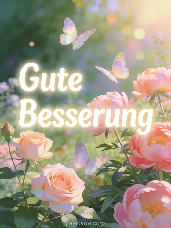Verschicke diese wunderschone Genesungskarte mit einem bluhenden Fruhlingsgarten mit Rosen, Pfingstrosen und schillernden Schmetterlingen, um gute Besserung zu wunschen. Entdecke auch eine Genesungskarte oder eine Genesungskarte mit Botschaft oder eine Genesungskarte mein Schatz.