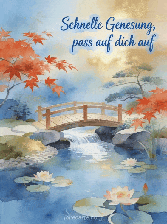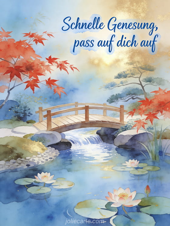Verschicke diese wunderschone Genesungskarte mit einem japanischen Zen-Garten mit einer Holzbrucke und bluhenden Seerosen, um gute Besserung zu wunschen. Entdecke auch eine Genesungskarte mein Schatz oder eine Heilungs-Liebeszitat-Karte oder eine Gute-Besserung-Karte.