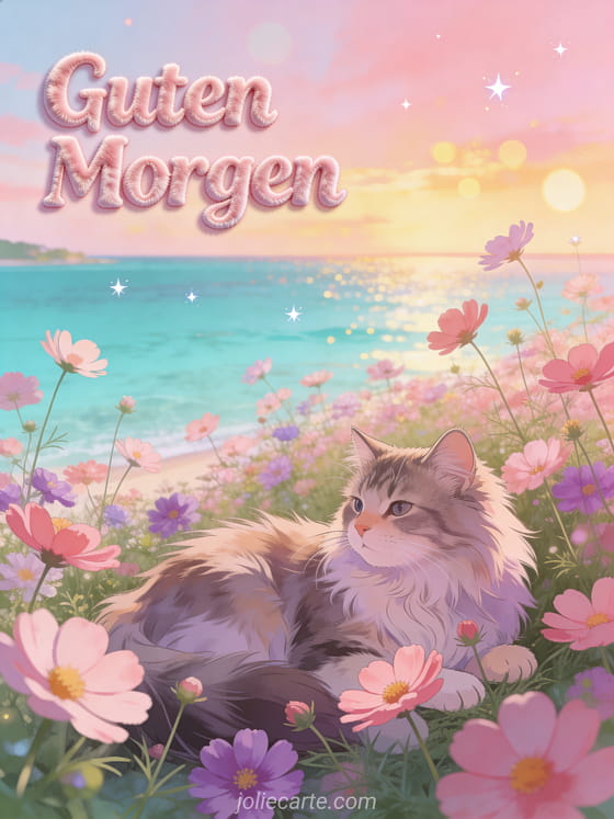 Versenden Sie einen zĂ€rtlichen Guten Morgen GruĂ mit einer flauschigen sibirischen Katze unter Kosmeen an einer tĂŒrkisfarbenen Paradiesbucht. Entdecken Sie auch eine Guten Morgen Oktober Karte oder eine Guten Morgen Paar Karte.