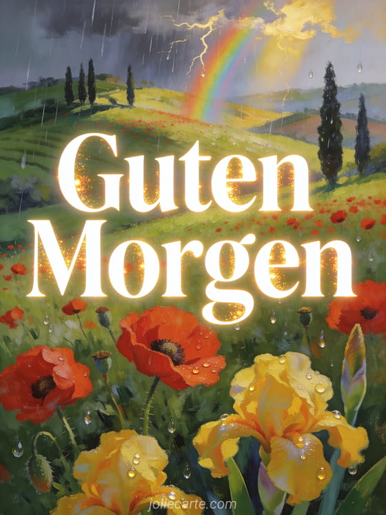Versenden Sie einen herzlichen Guten Morgen Gruß mit einer wunderschönen toskanischen Landschaft mit grünen Hügeln, roten Mohnblumen und einem Regenbogen. Entdecken Sie auch eine Guten Morgen Kuss Karte oder eine lustige animierte Guten Morgen Karte.