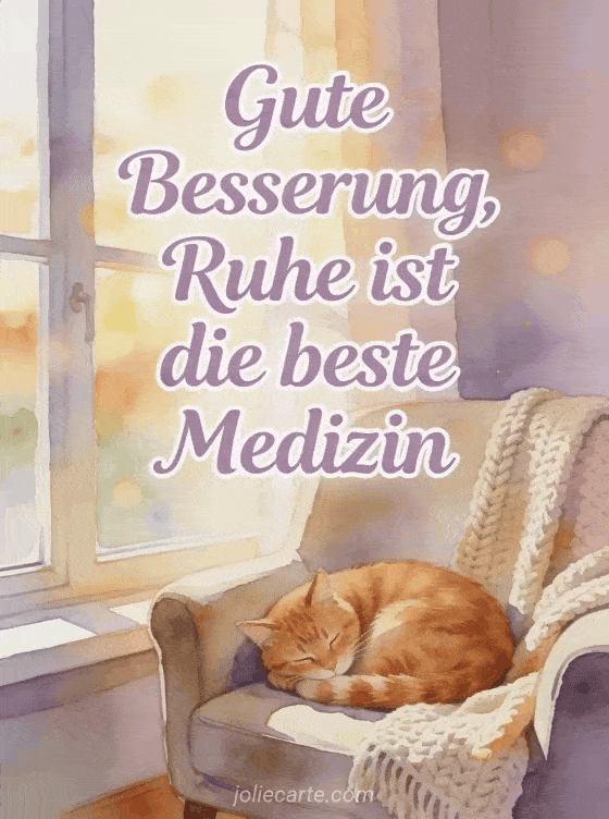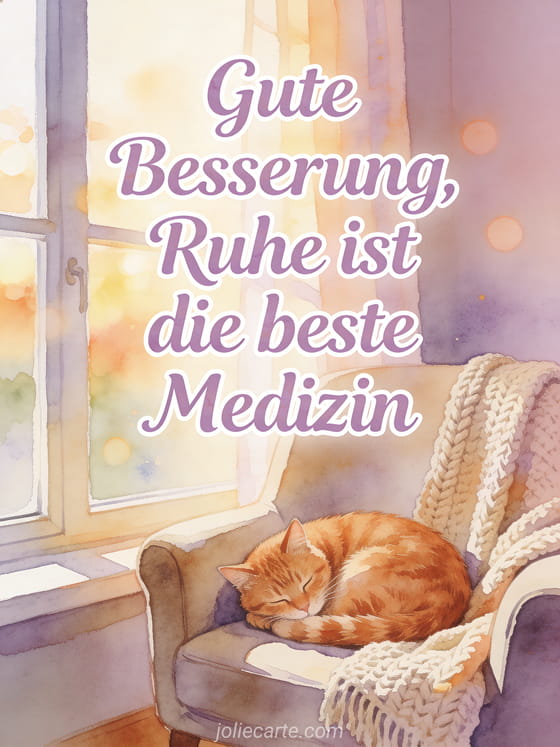 Senden Sie einen tröstenden Gute-Besserung-Gruß mit der Erinnerung, dass Ruhe die beste Medizin ist. Entdecken Sie auch eine Gute-Besserung-Karte, eine Genesungswünsche-Karte oder eine Karte für schnelle Genesung.