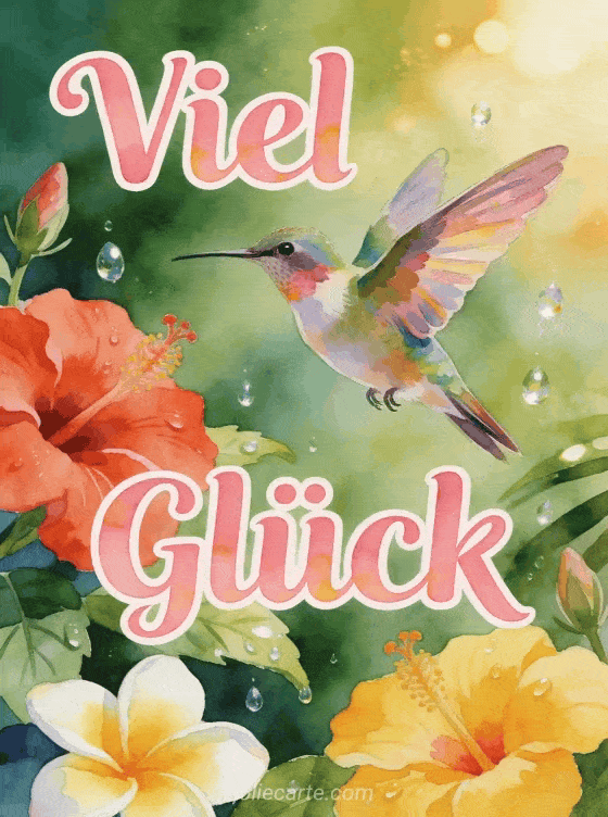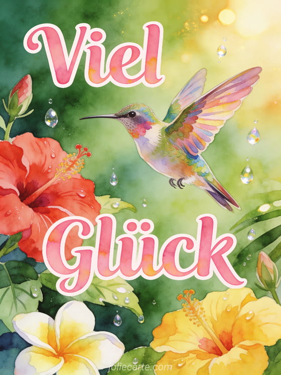 Wünsche jemandem viel Glück mit dieser farbenfrohen Grußkarte. Ein Kolibri mit schillernden Federn schwebt vor bunten tropischen Blumen wie rotem Hibiskus und gelbem Frangipani, mit funkelnden Wassertropfen und goldenem Licht.