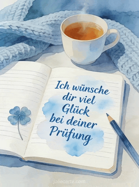 Versenden Sie einen herzlichen Glückwunsch zur Prüfung mit dieser gemütlichen Karte mit Notizbuch und Kleeblatt. Entdecken Sie auch ein Viel Glück Prüfung Gif oder eine Glückwünsche Prüfung Karte.