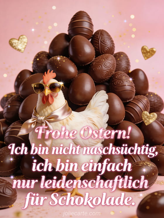 Teile diesen lustigen Ostergruss mit einem glamourosen Huhn mit goldener Sonnenbrille vor Schokoladeneiern auf rosafarbenem Hintergrund. Entdecke auch eine lustige Osterfest-Karte oder eine Oster-Humor-Karte.