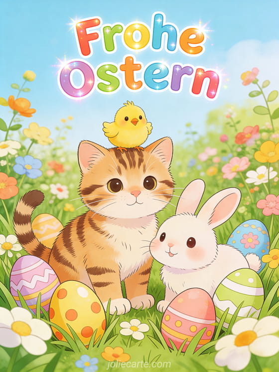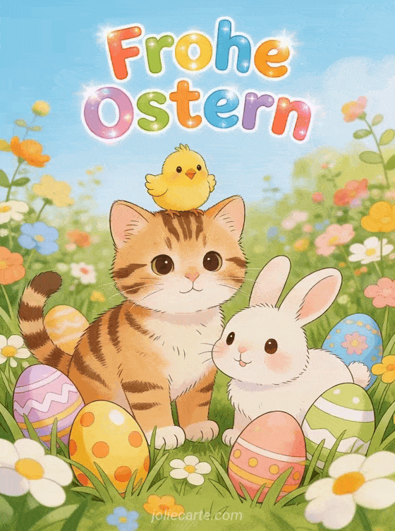 Teile diesen frohlichen Ostergruss mit entzuckenden Tieren in einem Ostergarten: ein Kuken auf dem Kopf eines Tigerkatzchens, ein kleines Haschen daneben, umgeben von verzierten Eiern im bluhenden Gras. Entdecke auch eine Osterhasen-Video-Karte oder eine Osterhasen-Gif-Karte.