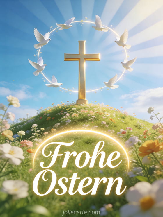 Feiern Sie die Freude von Ostern mit dieser leuchtenden religioesen Karte mit einem goldenen Kreuz umgeben von weissen Tauben auf einem fruehlingshaften Huegel. Entdecken Sie auch eine religiose Ostergrusskarte.