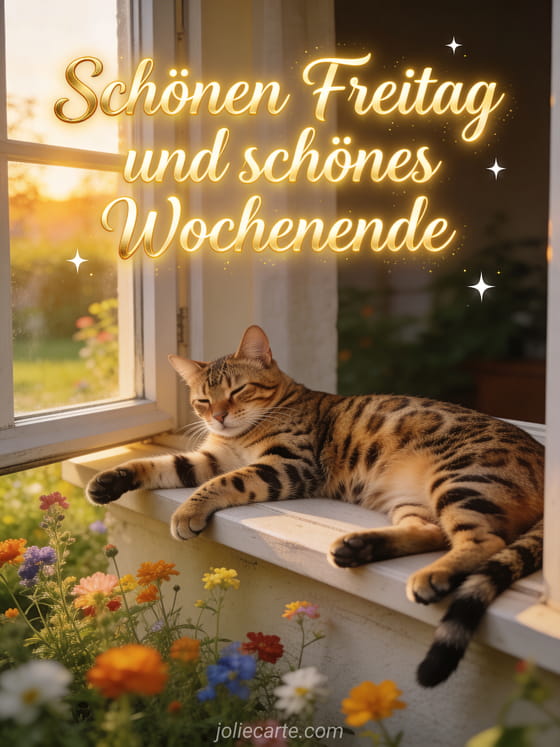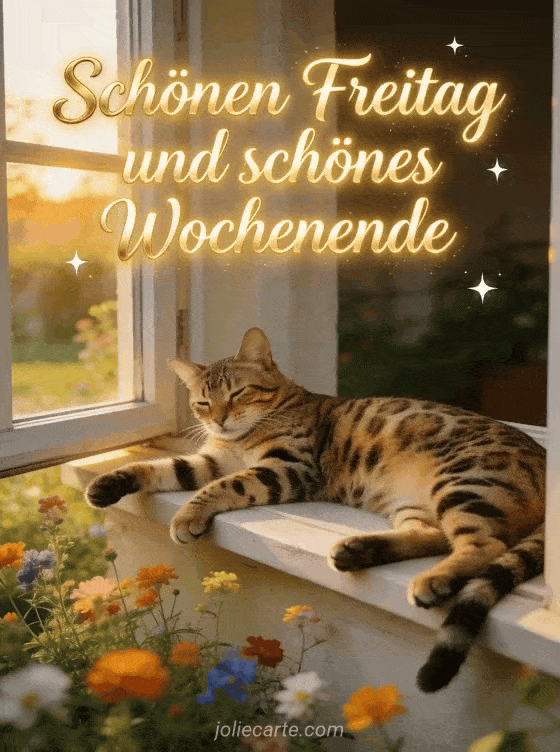 Versenden Sie einen fröhlichen Freitagsgruß mit einer Bengalkatze in einem sonnigen Garten für ein wunderschönes Wochenende. Entdecken Sie auch eine Regnerischer Freitag Karte oder ein lustiges Freitag Gif.