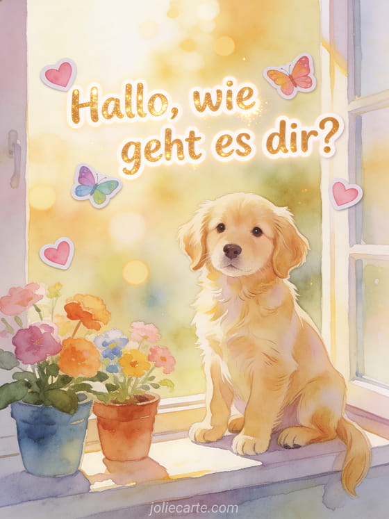 Senden Sie einen fröhlichen Wie-geht-es-dir-GruĂ, um jemandem den Tag zu versĂŒĂen. Entdecken Sie auch eine Karte mit guten Morgen Liebling wie geht es dir, mit hallo wie geht es dir oder mit hallo wie geht es dir heute.