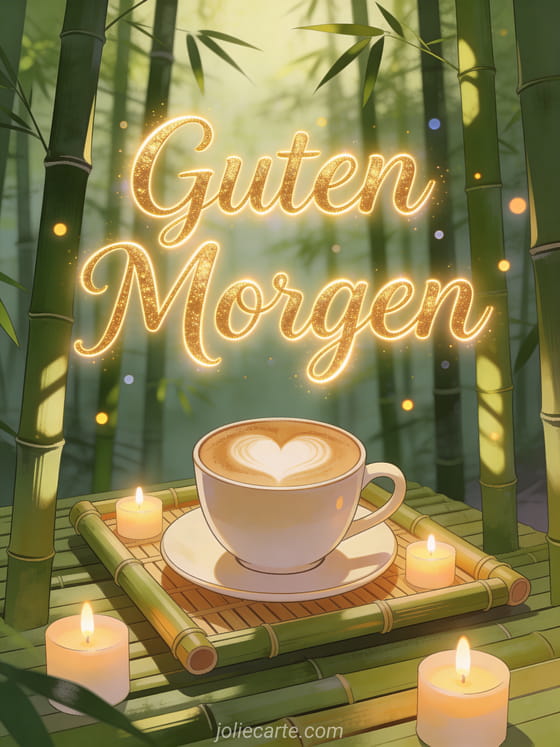 Verschicken Sie ein friedvolles Guten Morgen mit dieser Zen-Kaffee-Karte. Eine Latte-Art-Kaffeetasse mit Herz steht auf einem Bambustablett in einem Bambushain, mit brennenden Kerzen rundherum, Licht das durch hohe grüne Bambusstämme fällt und leuchtenden Punkten in der Luft. Entdecken Sie auch eine Guten-Morgen-Karte mit Blumenboot, eine Guten-Morgen-Kaffee-Karte am Meer oder eine Guten-Morgen-Küsschen-Kaffee-Karte.