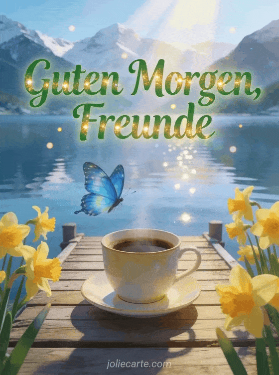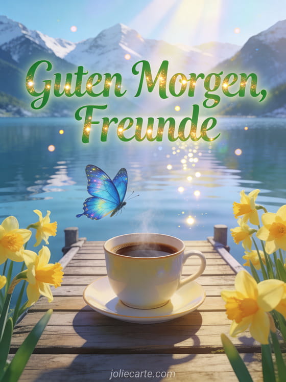 Beginnen Sie den Tag mit dieser magischen Karte mit einer dampfenden Kaffeetasse auf einem Holzsteg an einem Bergsee, einem blauen Morpho-Schmetterling, gelben Narzissen und funkelnden Lichtpunkten. Entdecken Sie auch eine lustige Guten-Morgen-Kaffeekarte oder eine Guten-Morgen-Kaffee-Herz-Karte.