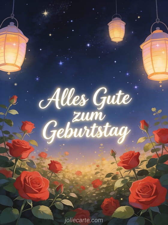 Wünschen Sie ihr alles Gute zum Geburtstag mit dieser märchenhaften Karte mit einem blühenden Rosengarten und hängenden Laternen unter funkelnden Sternen. Entdecken Sie auch eine Geburtstagskarte mit Lavendel oder eine Geburtstagskarte mit Rosenherz.