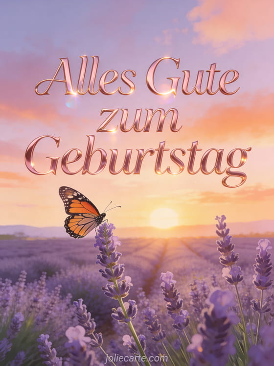 Wünschen Sie ihr alles Gute zum Geburtstag mit dieser poetischen Karte mit einem Lavendelfeld bei goldenem Sonnenuntergang mit einem Monarchfalter auf einem Stiel. Entdecken Sie auch eine Geburtstagskarte mit Rosenherz oder eine Geburtstagskarte mit Tulpen.