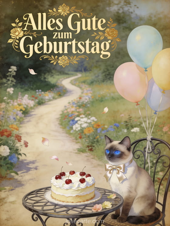 Wünschen Sie ihr alles Gute zum Geburtstag mit dieser eleganten Vintage-Karte mit einer Siamkatze neben einem Kuchen mit Kirschen auf einem Landweg. Entdecken Sie auch eine Geburtstagskarte mit Champagner oder eine lustige Geburtstagskarte für sie.