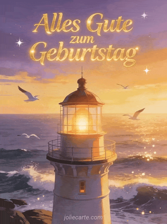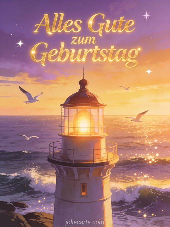 Feiern Sie einen Geburtstag mit dieser atemberaubenden Karte, die einen prächtigen Leuchtturm am Meer bei Sonnenuntergang zeigt, mit funkelnden Wellen, lila-goldenen Himmeln und Seevögeln im Flug. Entdecken Sie auch eine Geburtstagskarte mit Schmetterling oder eine romantische Geburtstagskarte.