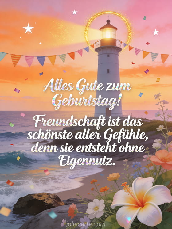 Versenden Sie diese poetische Freundschafts-Geburtstagskarte mit einem Leuchtturm an der Küste in der Abenddämmerung mit Wildblumen und Tiareblüte im Vordergrund, bunten Wimpeln und Konfetti in der Meeresluft. Entdecken Sie auch eine Geburtstagskarte für Freunde oder eine lustige Geburtstagskarte.