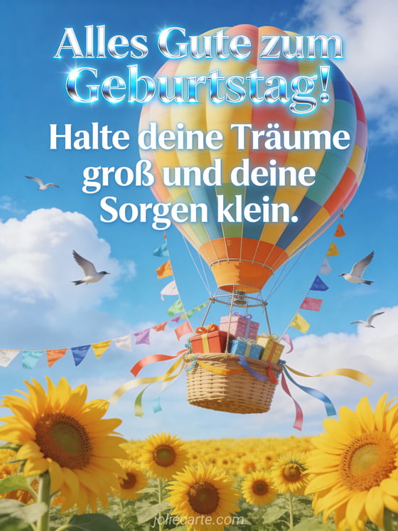 Alles Gute zum Geburtstag! Halte deine Träume groß und deine Sorgen klein. eine fröhliche Geburtstagskarte mit einem Heißluftballon über Sonnenblumenfeldern