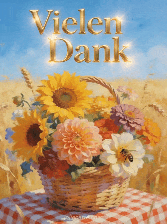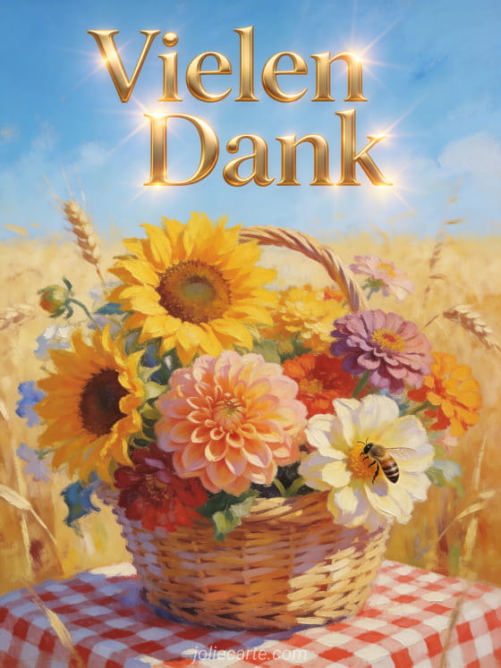 Drücken Sie Ihre tiefe Dankbarkeit mit dieser fröhlichen Karte aus, die Sonnenblumen und Dahlien in einer leuchtenden Sommerkulisse zeigt. Eine warme und fröhliche Illustration, um Vielen Dank zu sagen. Entdecken Sie auch eine Danke für Ihre Antwort Karte oder eine Danke und schönen Tag Karte.