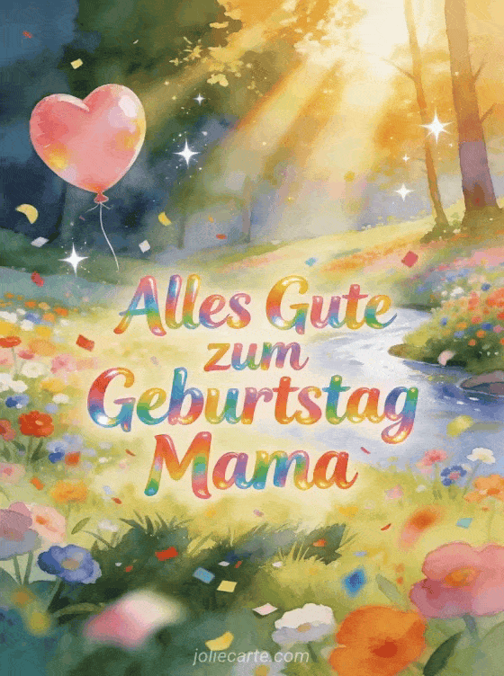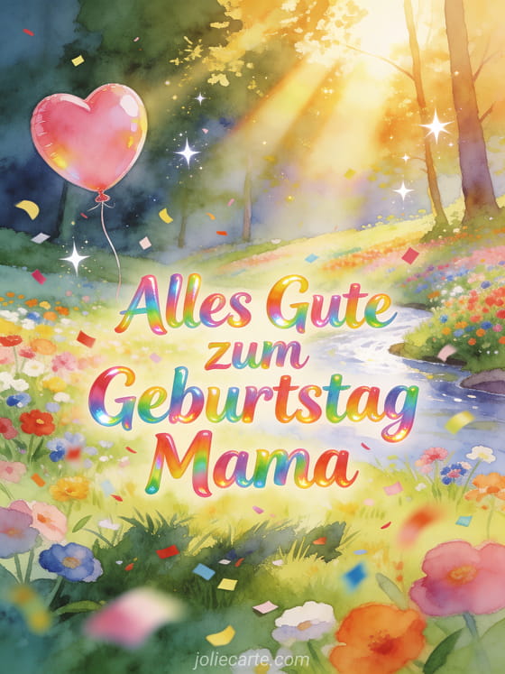 Feiere den Geburtstag deiner Mama mit dieser wunderschönen kostenlosen Karte mit einem blühenden Tal mit Fluss, einem rosa Herzballon, buntem Konfetti und goldenem Sonnenlicht. Ein lebhafter Aquarell-Gruß. Entdecke auch ein Geburtstagsbild für Mama oder eine animierte Geburtstagskarte für Mama.