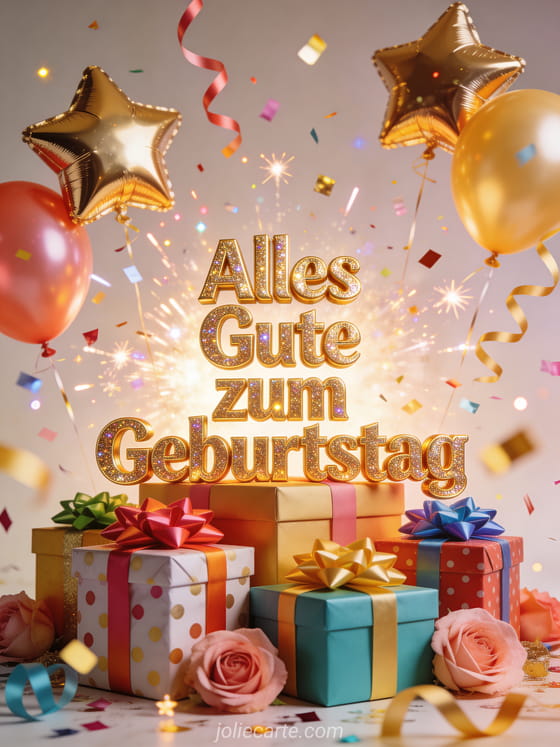 Verschicke eine festliche Geburtstagskarte mit gestapelten Geschenken mit bunten Schleifen, goldenen und rosa Sternballons, Konfetti-Explosion und Glitzer. Warme und helle Atmosphäre. Entdecke auch eine Geburtstagskarte für Mama oder eine virtuelle Geburtstagskarte für Mama.