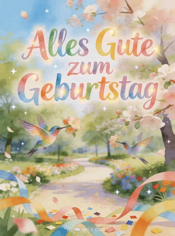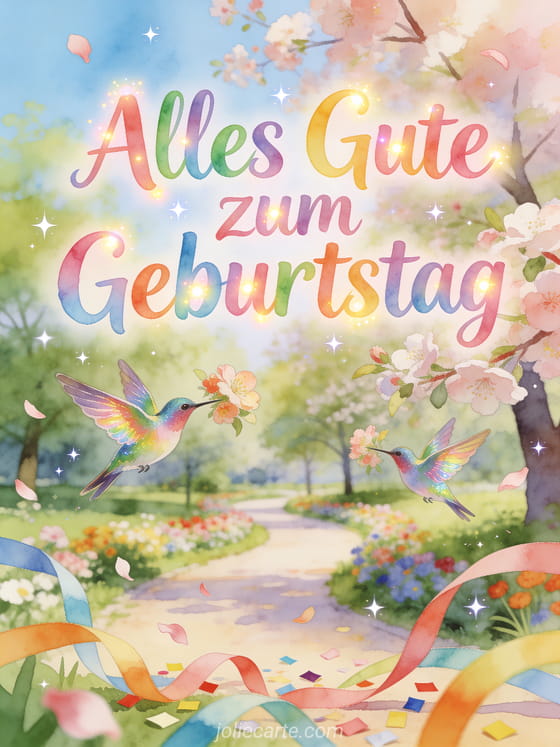 Feiere den Geburtstag deiner Schwester mit dieser wunderschönen kostenlosen Karte mit einem frühlingshaften Park voller Blumen, einem Kolibri und buntem Konfetti. Ein fröhlicher und frischer Gruß. Entdecke auch eine berührende Geburtstagskarte für die Schwester oder eine Geburtstagskarte für die große Schwester.
