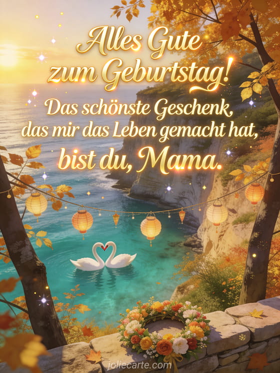 Feiere den Geburtstag deiner Mama mit dieser wunderschönen kostenlosen Karte mit einer poetischen herbstlichen Küstenszene, Schwänen und goldenem Licht. Eine liebevolle Art zu sagen, dass sie das schönste Geschenk ist. Entdecke auch eine berührende Geburtstagskarte für Mama oder eine Geburtstagskarte für die beste Mama.