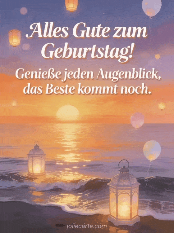 Feiern Sie einen Geburtstag mit dieser poetischen Karte mit einem prächtigen Sonnenuntergang über dem Meer, schwebenden Laternen, goldenen Reflexionen auf ruhigem Wasser und Pastellballons. Entdecken Sie auch ein Geburtstags-GIF für Teenager oder ein Geburtstagsbild für Teenager.