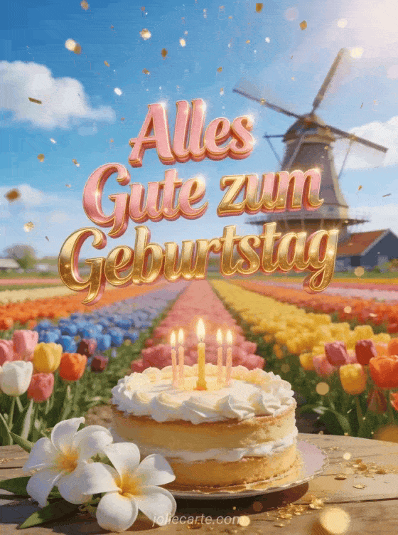 Feiern Sie einen besonderen Geburtstag mit dieser farbenfrohen Karte mit endlosen Tulpenfeldern, Tiaré-Blumen, einem dekorierten Kuchen mit brennenden Kerzen und goldenem Glitzerregen. Entdecken Sie auch eine Geburtstagskarte mit Glückwünschen oder ein kostenloses Geburtstagsbild.