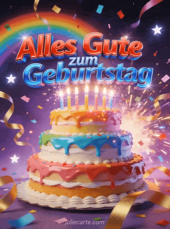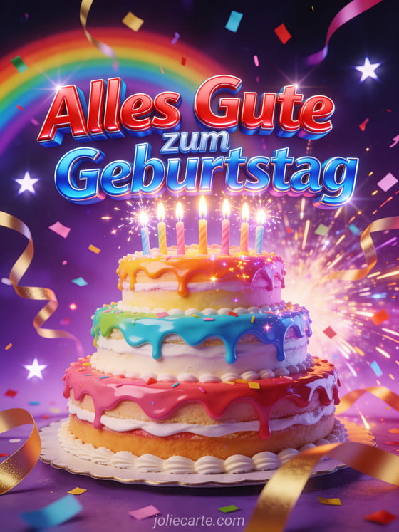 Feiern Sie mit dieser spektakulären Geburtstagskarte mit einer mehrstöckigen Torte mit funkelnden Kerzen, einer Explosion von Regenbogen-Konfetti und goldenen Bändern auf einem sternenbedeckten violetten Hintergrund. Entdecken Sie auch eine Geburtstagskarte mit Text für Teenager oder ein Geburtstags-GIF für Teenager.