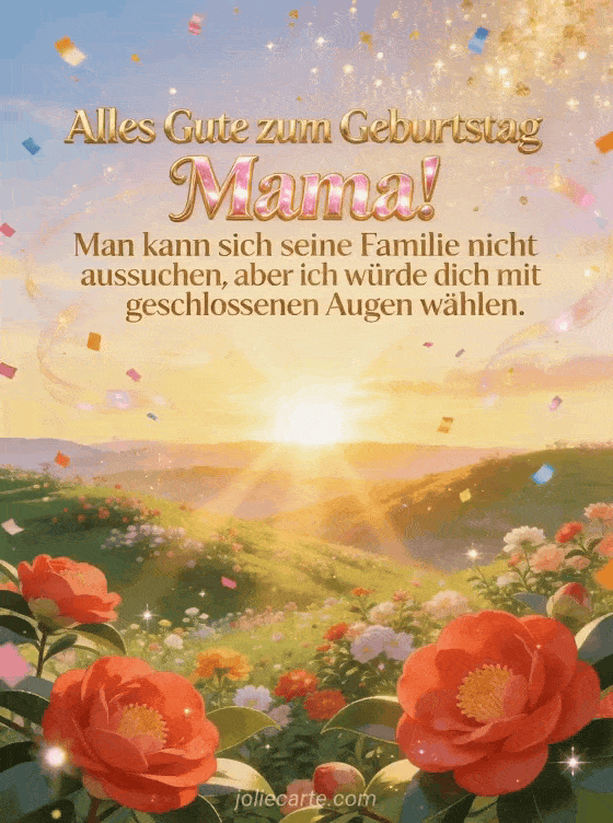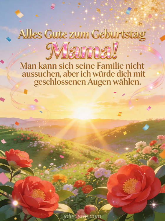 Feiern Sie den Geburtstag Ihrer Mama mit dieser strahlenden Karte mit einem blühenden Tal bei goldenem Sonnenaufgang mit leuchtenden roten Kamelien, goldenem Glitzerregen und buntem Konfetti im Morgenlicht. Entdecken Sie auch eine Geburtstagskarte Nachricht für Mama oder eine Geburtstagskarte für die beste Mama.